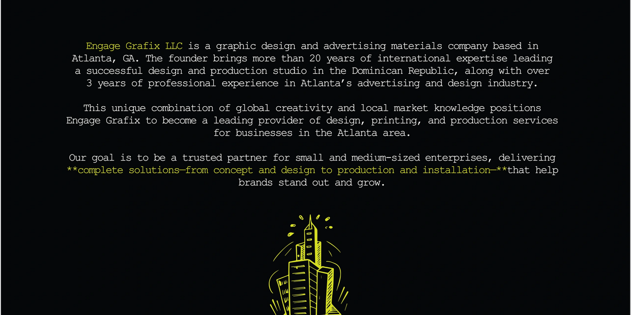 With over 20 years of international design and production experience, and more than 3 years in Atlanta’s advertising industry, founder and creative director Leonardo combines global creativity with local expertise to lead Engage Grafix in offering end-to-end solutions—from concept to installation—that enhance the brand presence of small and medium-sized businesses.